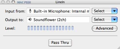 Per vedere, anzi sentire, se tutto funziona, provate a caricare una radio in streaming (ad esempio da iTunes, ma anche Real Player e via dicendo...) e a premere Record. Si può mettere la registrazione in pausa e quando si preme Stop il programma richiede dove salvare il file contenente la registrazione. Il vostro iPod ve ne sarà grato...;-) 4. Registrare l'audio di una chiamata Skype Per registrare una chiamata abbiamo bisogno di incanalare anche l'audio del microfono verso Soundflower. A tale scopo utilizziamo LineIn, un'altra minuscola utility dal funzionamento immediato. E' sufficiente decidere quale input deve essere passato a Soundflower, come in figura:
