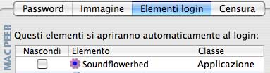 (freeware): 2. Configurare Soundflower Soundflower è un driver audio virtuale che si comporta esattamente come una periferica reale (una scheda audio), con i suoi input e i suoi output. Dopo aver installato il pacchetto e riavviato, per prima cosa si deve fare in modo che l'applicazione Soundflowerbed (compresa nell'installer) venga caricata all'avvio di OSX. Per far questo andare in Preferenze di Sistema/Account/Elementi login e aggiungere Soundflowerbed dalla cartella Applicazioni.