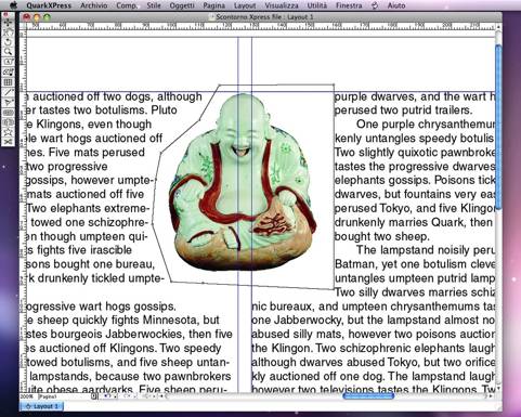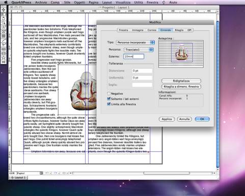 di XPress. Dal menu Oggetti selezionare il comando Circonda. Selezionare da Tipo la voce Percorso incorporato, quindi da Percorso selezionare il tracciato di ritaglio (creato precedentemente con Photoshop). Nel campo Esterno indicare la distanza di scontorno che l’immagine deve avere dal testo.